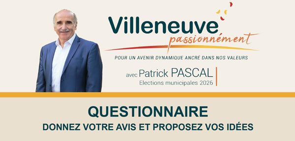 L’équipe « Villeneuve passionnément » conduite par Patrick Pascal se présentera à vos suffrage lors des élections municipales des 15 et 22 mars 2026. Ce site internet vous permettra d’être informé de notre actualité, de découvrir les 17 villeneuvoises et villeneuvois de l’équipe et de prendre connaissance de notre programme et de nos projets. Nous vous souhaitons une bonne consultation et n’hésitez pas à dialoguer avec nous par l’intermédiaire de la rubrique contact.